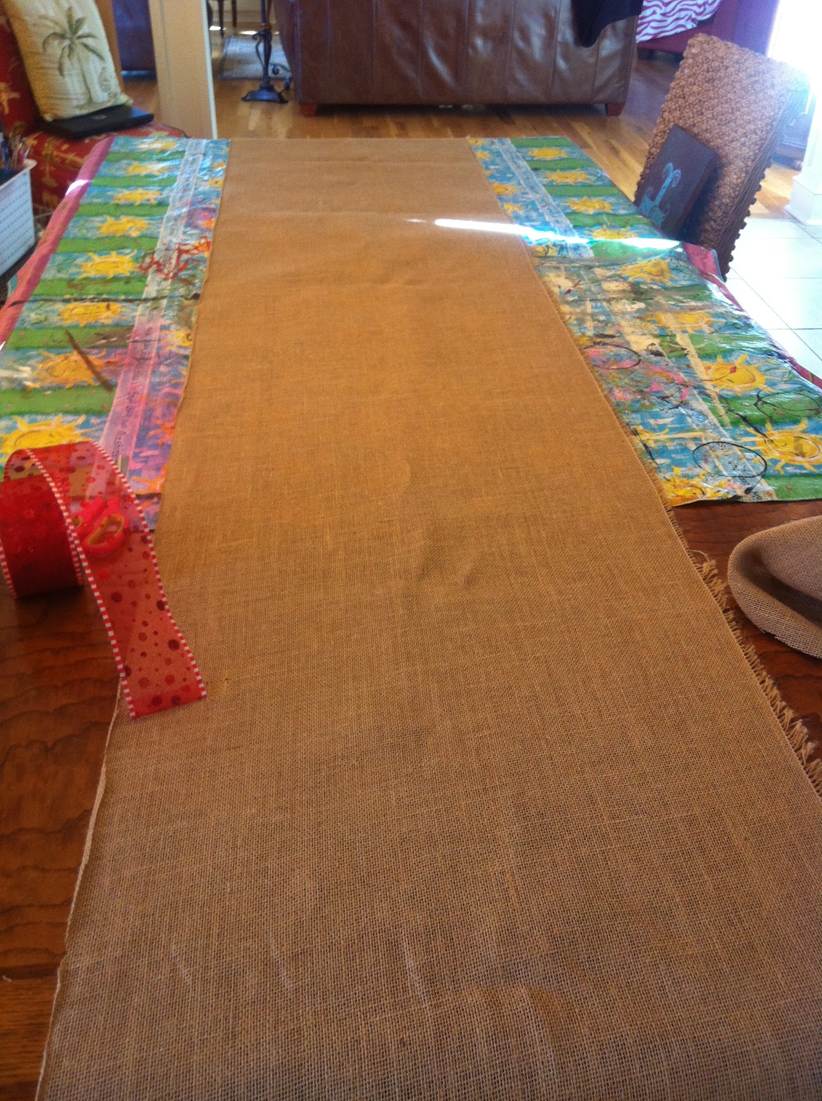 While the boys have been busy recuperating and watching sports, I have gone crafting crazy. I love working with burlap so I got an idea to make a table runner for my dining room table. Since our table is "technically" a conference table and is over 8 feet long, I can never find a runner.